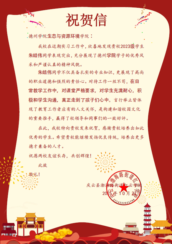喜报!我校支教学子朱皓伟获服务学校高度赞扬近日,我校太阳成集团tyc33455收到一封来自庆云县渤海路街道红云学校的祝贺信,信中,红云学校对我校2023级支教学生朱皓伟同学在支教服务期间的卓越表现给予了高度评价和热烈祝贺。在红云学校支教期间,朱皓伟...