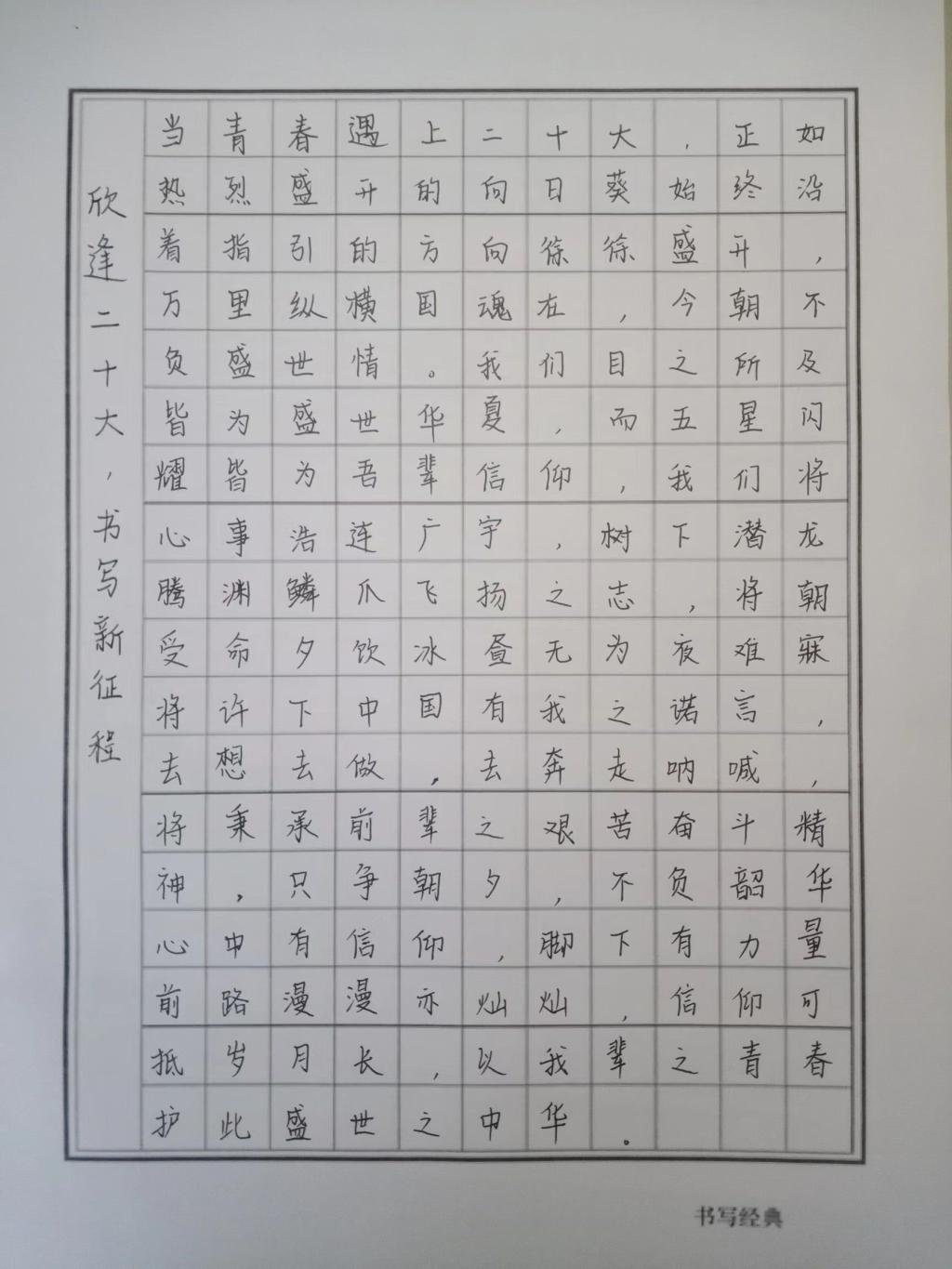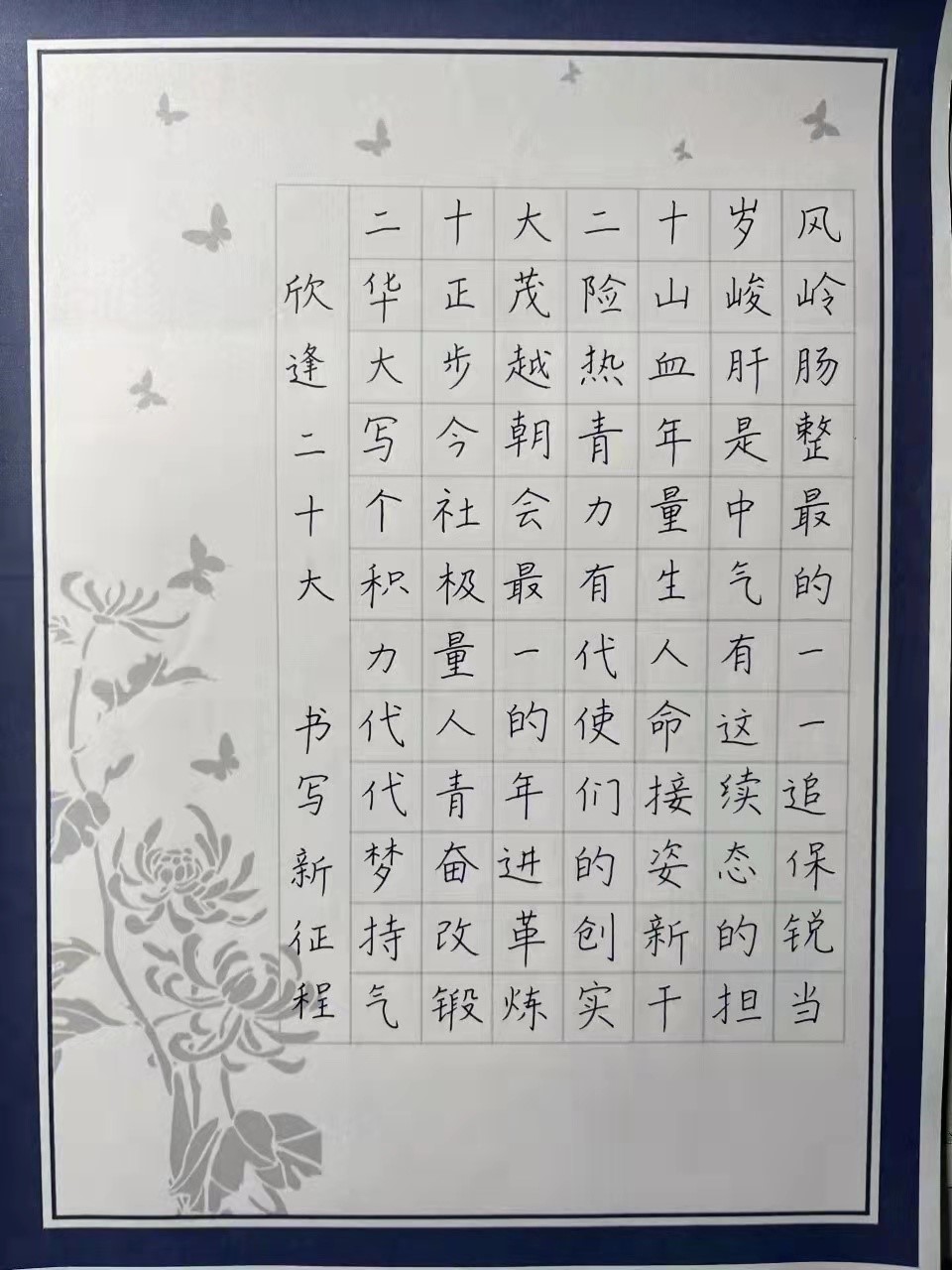 新时代青年应当砥砺前行,锐意进取,不忘习近平总书记在中国共产党第二十次全国代表大会报告中的殷切寄语。为此太阳成集团tyc33455于2022年11月10日举办线上“欣逢二十大,书写新征程”硬笔书法活动。