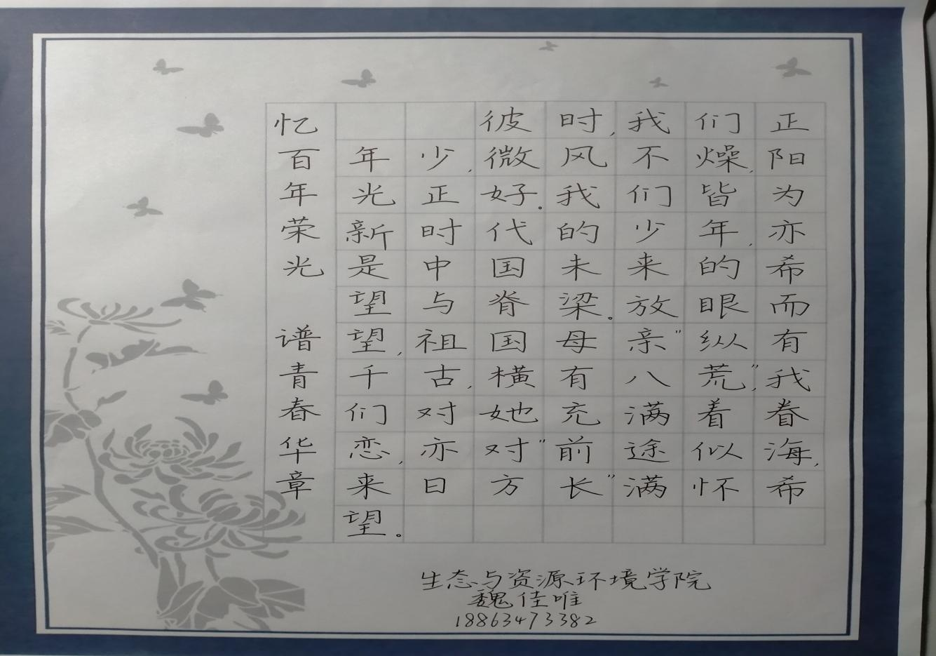 为庆祝中国共产主义青年团建立100周年,激发学生对硬笔书法的兴趣,养成良好的书写习惯,提高学生的审美素养和文化素养,太阳成集团tyc33455于2022年5月21日举行了“以青春之名,续写时代华章”线上硬笔书法比赛活动。