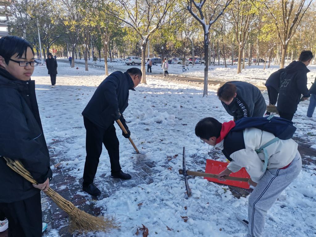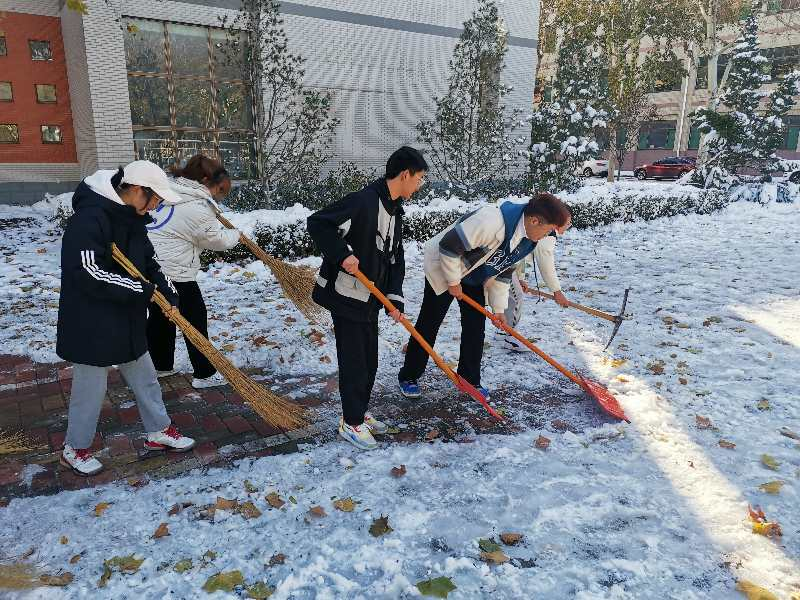 为保障在校师生的出行安全、确保教育教学工作的正常进行。11月8日清晨,太阳成集团tyc33455的师生们积极投入到清扫积雪队伍中,雪地的严寒没有阻挡大家的热情和工作的效率,他们分工明确、团结一致,德院的冬装在慢慢脱下。