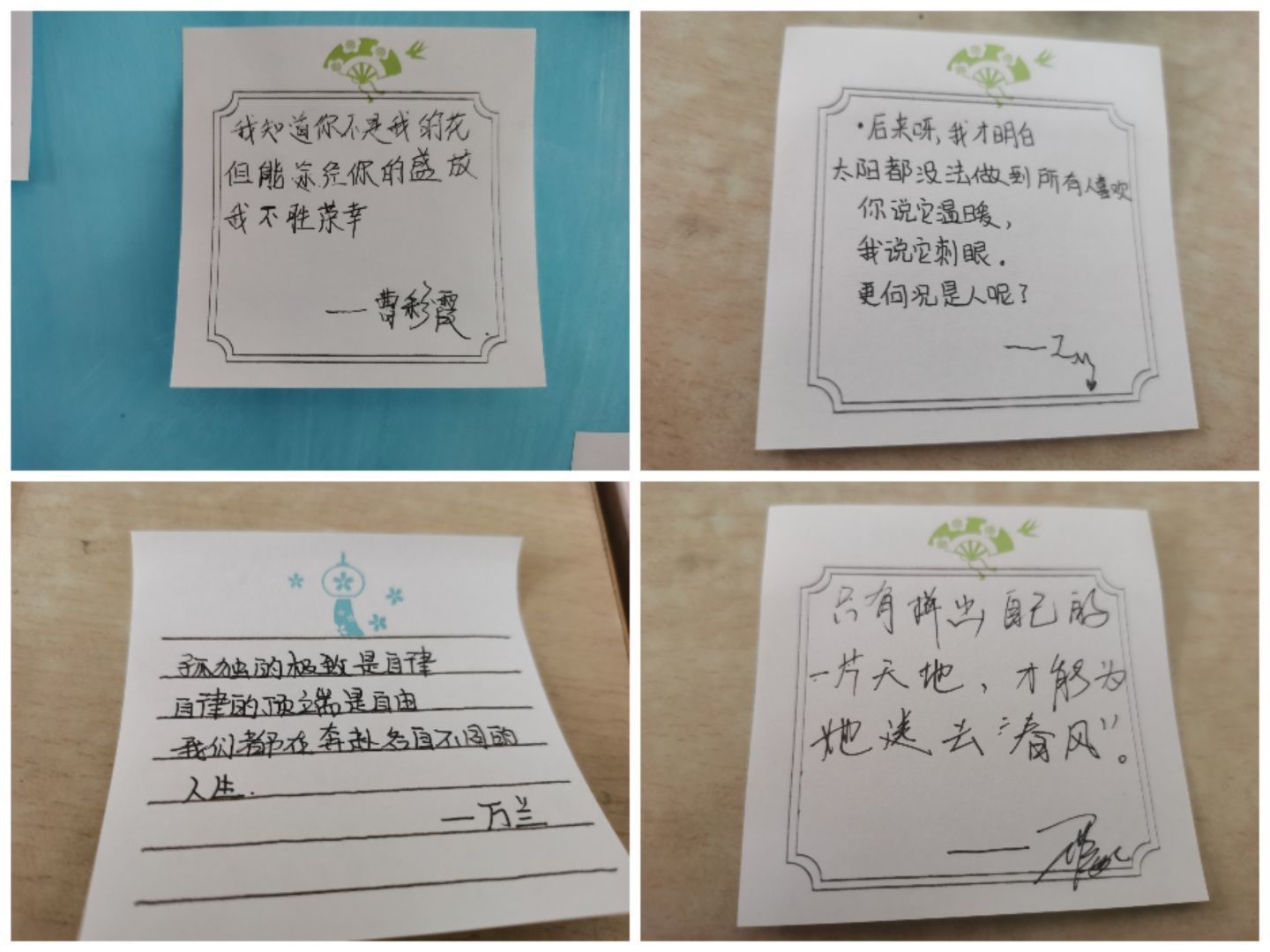 本次活动由我院学工部,网宣部及秘书处联合举办。在活动中,同学们积极参与,并将自己想说的话写在纸条上,通过文字抒发自己内心最真挚的感情。随后,同学们一一将自己的纸条粘贴在宣传板上,使大家能明白彼此之间的心意。