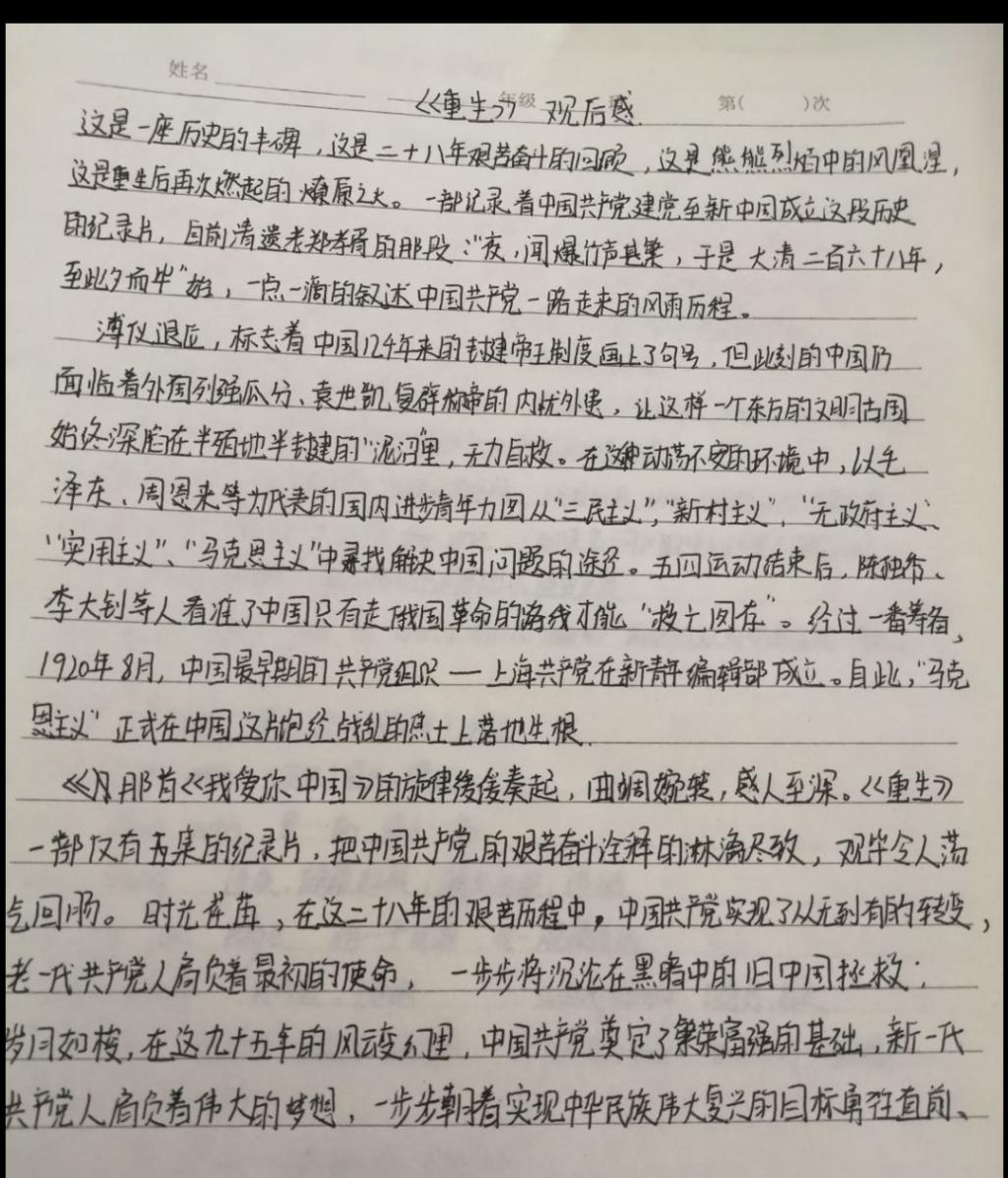 本次活动由我院学生会社团部举办,活动围绕观看党史纪录片《重生》展开。活动线上公布初始,便有许多同学积极踊跃的报名参加,在学习党史的同时,近距离了解共产党员的人生价值观和高尚情怀,感悟历史,并书写观后感。然后将自己的作品发给活动负责人,分享自己的感悟。