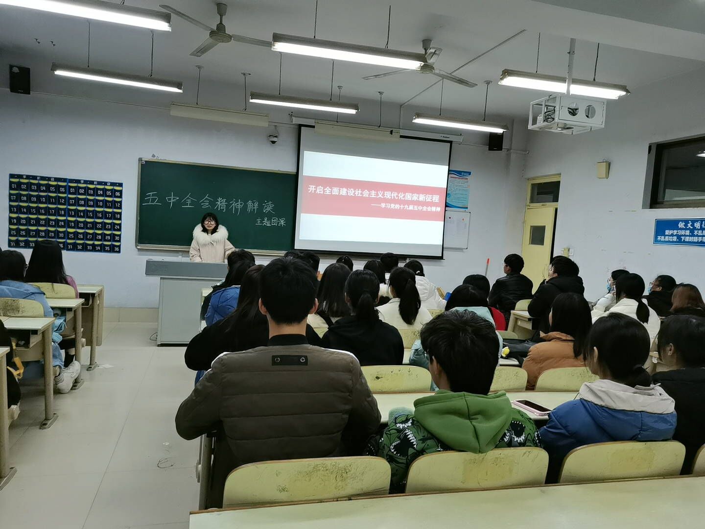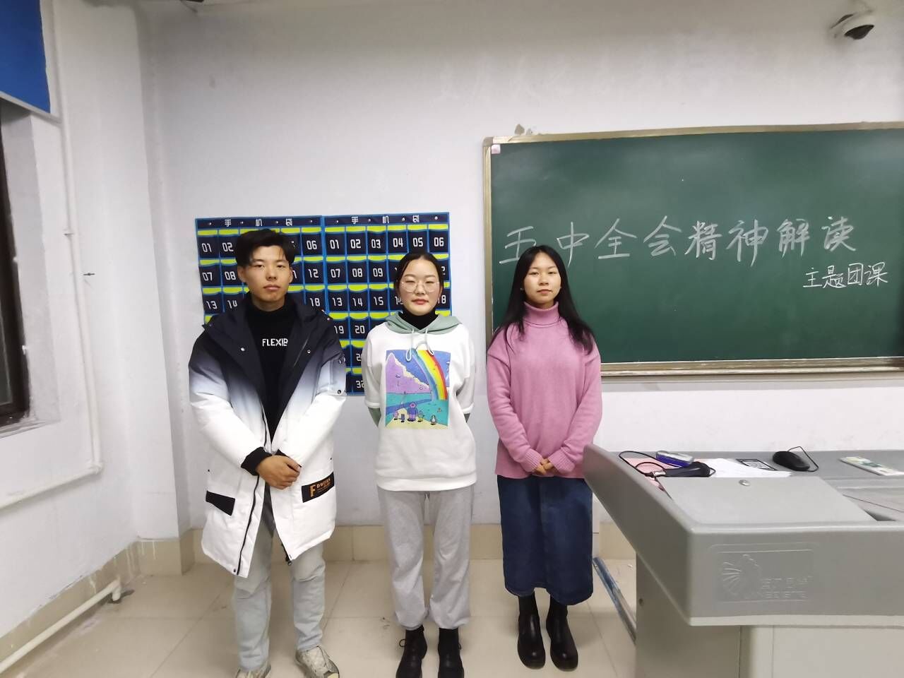 为深入学习宣传五中全会精神,以新思想引领新征程,贯彻落实总局团委开展“学习五中精神青年在行动”主题活动要求,加强基层团组织凝聚力,11月26日下午,2020级地理科学类一班组织开展“学习五中精神”主题团课活动。