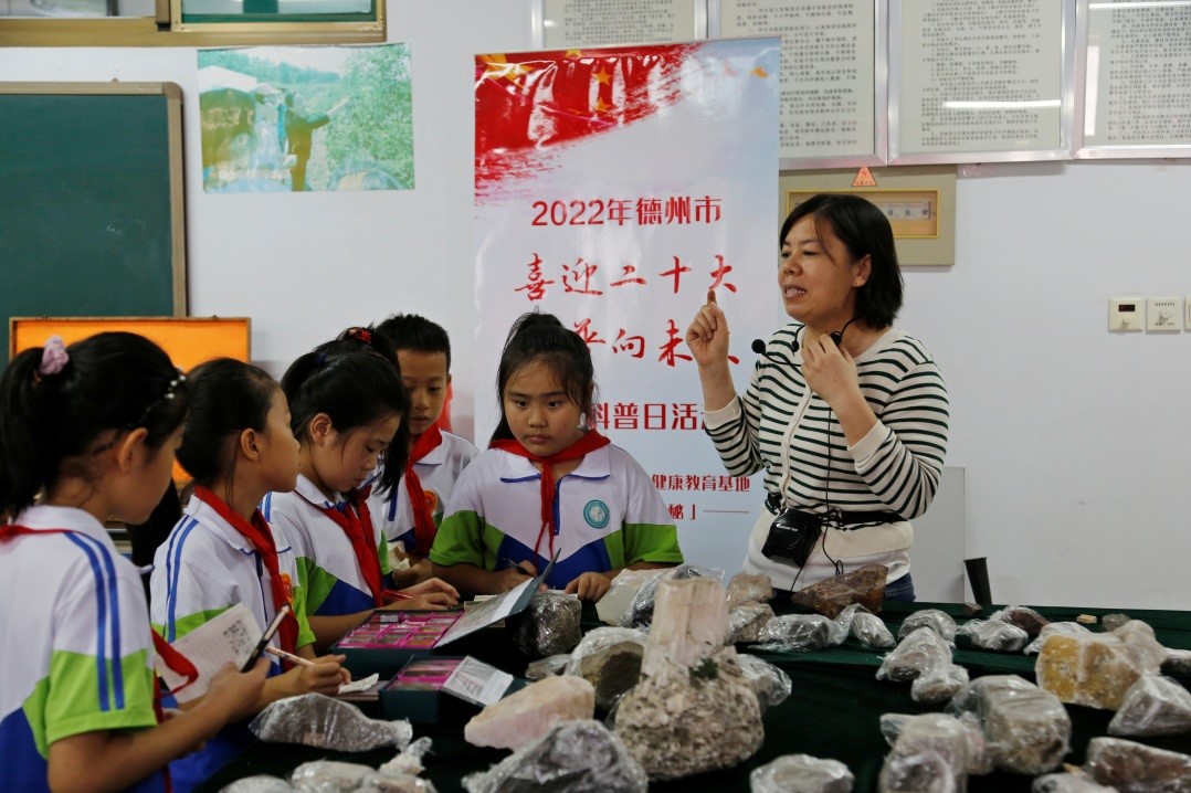 祁兴芬老师给同学们讲解了矿石的形成、矿产的分布、不同岩石的组成等地质学知识。同学们听得津津有味,并且认真地做着笔记。