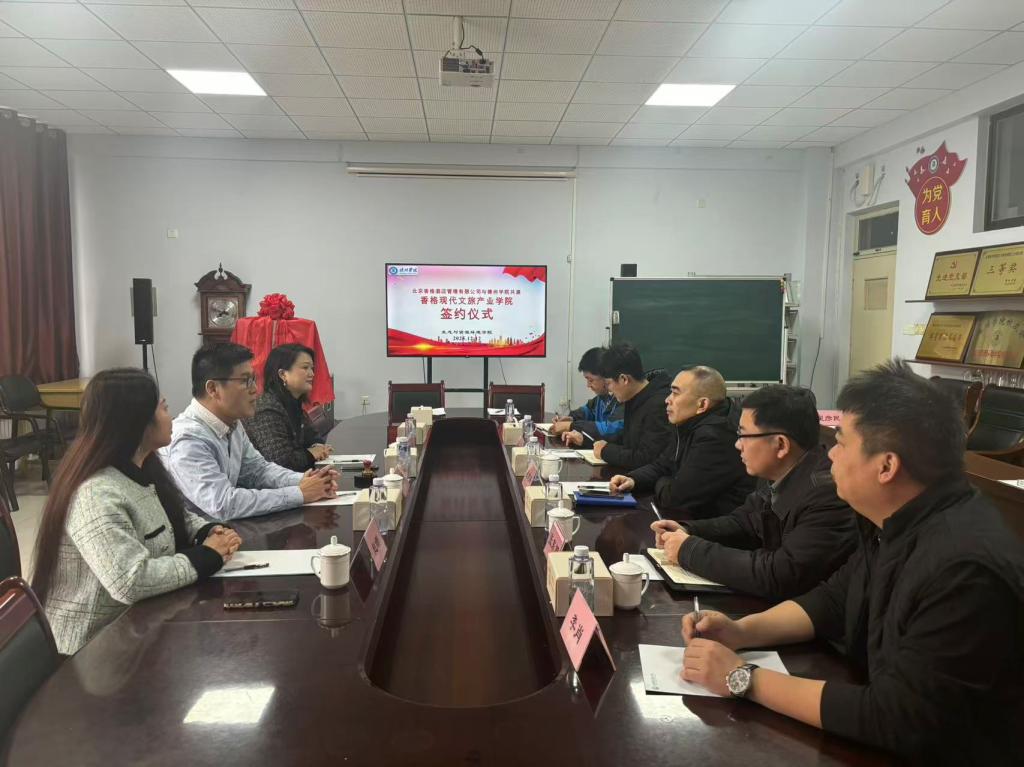 为深化产教融合、创新人才培养模式,共同推动现代文旅产业高质量发展,12月12日,北京香格酒店管理有限公司与太阳成集团tyc33455cc在求实楼302会议室举行合作签约仪式,正式揭牌共建“香格现代文旅产业学院”。北京香格酒店管理有限公司总经理曹杨、副总经理王宁、课程建设中心主任赵娜,太阳成集团tyc33455领导班子、旅游管理系教师代表及教学办公室相关人员共同出席仪式。