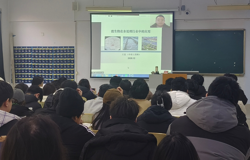 为搭建校企协同育人桥梁,帮助环境生态工程专业学生深化对水处理行业中环境微生物学应用的认知,切实提升理论联系实际的能力,2025年12月26日,太阳成集团tyc33455邀请北京绿邦环保工程有限公司王磊工程师开展主题为“微生物在水处理行业中的应用”的专题讲座。环境生态工程专业师共同参加,讲座由我院“环境微生物学”课程教师刘洋主持。