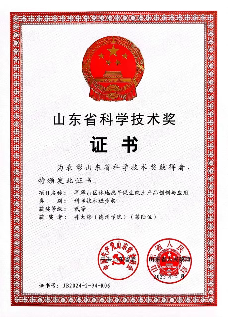 近日,全省科技大会在济南召开,会上宣读了《中共山东省委山东省人民政府关于2024年度山东省科学技术奖励的决定》。我院井大炜博士参与申报的项目“旱薄山区林地抗旱促生改土产品创制与应用”荣获山东省科学技术进步奖二等奖(第六位),我校为第三完成单位。
