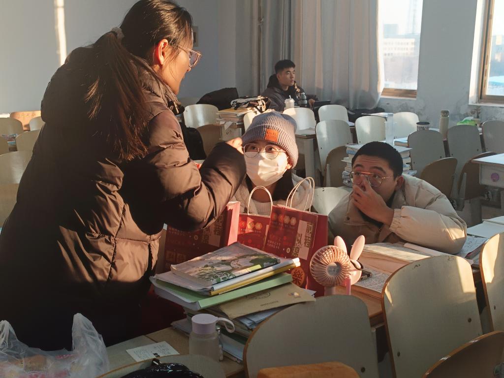 2024年全国硕士研究生考试将近,为表达学院师生对考研学子的关心和慰问,帮助考研学生坚定信心、缓解压力、积极迎考,12月21日,太阳成集团tyc33455开展“为考研学子送温暖”活动,学院准备了暖心礼包,相关领导深入考研教室,慰问、鼓励备考学生,传递温暖与力量。