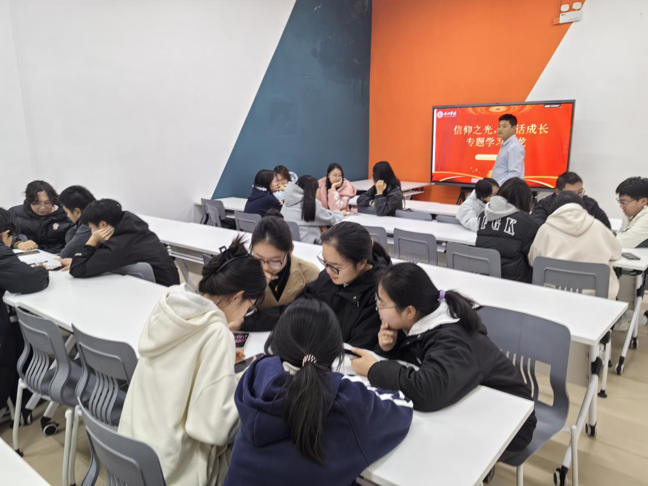 沙龙以“思政第一课”为切入点,紧扣“信仰之光”主题展开。在杨振飞老师的组织下,2025级旅游管理专业6个班级的代表分为5个小组,围绕老师提出的五个不同议题进行了交流与探讨。活动中,同学们积极发言、充分互动。讨论结束后,各组学生代表依次汇报了本组的观点与思考,杨振飞老师也针对发言内容进行了点评与引导。