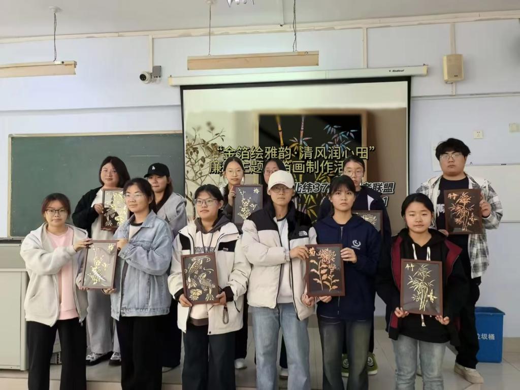 活动现场,学生们通过视频了解了金箔画的历史渊源与制作技法,从金箔的轻柔取用、胶水的均匀涂抹到线条的细致勾勒,引导学生解锁传统工艺的奥秘。同学们以“梅兰竹菊”四君子为创作核心,将梅花的傲骨、兰花的高洁、竹子的坚韧、菊花的淡泊融入金箔画中——指尖轻捻金箔,在卡纸上游走拼贴,原本轻薄易碎的金箔,在耐心与专注下逐渐化为一幅幅兼具非遗质感与廉洁寓意的作品,让廉洁理念在技艺实践与交流中深入人心。