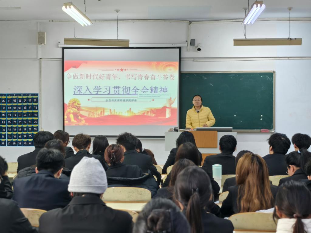 李老师重点强调,党的二十届四中全会召开于“十四五”规划收官与“十五五”规划谋篇布局的关键历史节点,全会审议通过的《中共中央关于制定国民经济和社会发展第十五个五年规划的建议》,明确了未来五年国家发展的总体思路与战略任务,是指导经济社会高质量发展的纲领性文件,具有承前启后、凝心聚力的里程碑意义。结合学院专业特色,她围绕全会提出的“加快经济社会发展全面绿色转型,建设美丽中国”等核心部署展开解读,系统回顾了“十四五”时期我国生态环境保护领域的重大成就,引导学子深刻认识生态环境学科在推进中国式现代化进程中的重要使命,为青年成长成才锚定了专业发展与责任担当的双重方向。