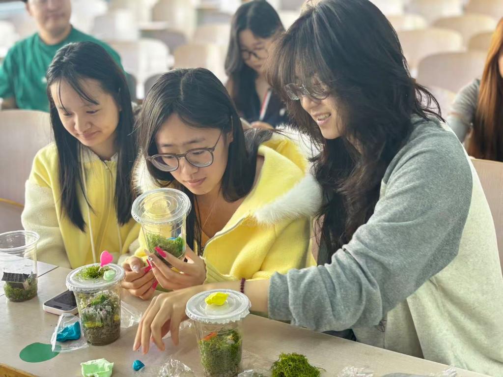 活动现场,同学们领取废弃咖啡杯、苔藓及小摆件等材料,以闲置咖啡杯为容器,搭配绿植与装饰,制作独具特色的微景观。大家在动手创作中体会资源循环利用的乐趣,将低碳环保理念融入实践,现场氛围温馨热烈。作品完成后,协会对作品进行收集,并评选出优秀创意作品。
