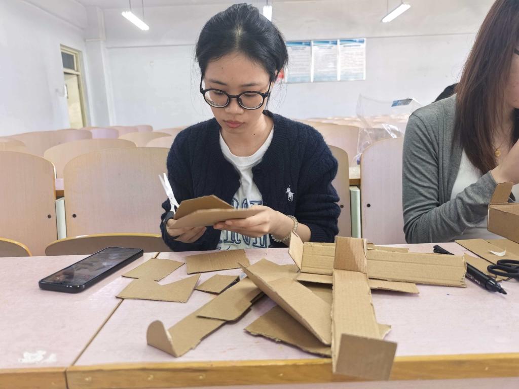 活动现场暖意融融,废弃快递纸盒与剪刀、橡皮泥、彩笔等工具相映成趣。同学们以想象力为翼,循着裁剪、折叠、拼接、装饰的工序,将平凡纸盒雕琢成风格各异的收纳摆件、创意模型与艺术小品,每一件作品都暗藏巧思。创作中,大家围坐交流、切磋技艺,在指尖流转间收获手工的治愈与乐趣,环保理念也在互动中悄然传递,现场氛围温馨热烈。作品完成后,大家逐一展示分享,用镜头定格创意与环保相拥的美好瞬间。