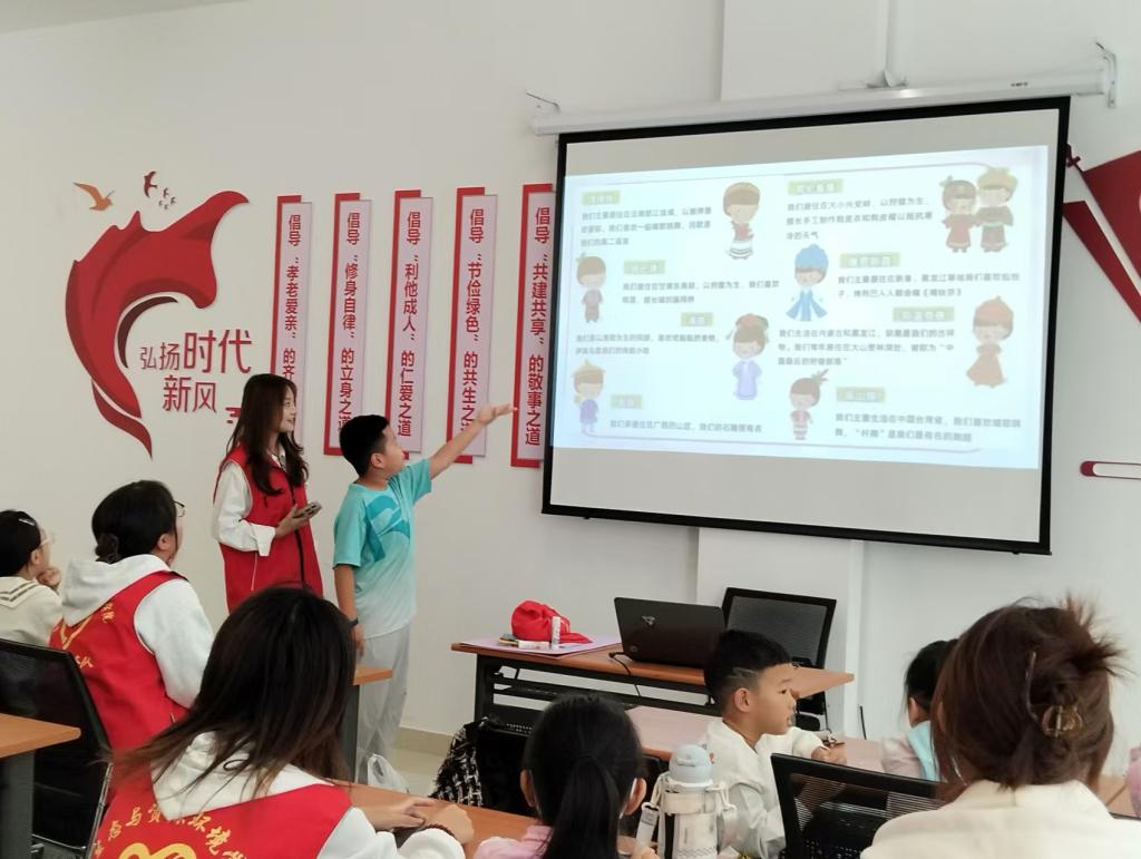 志愿者采用动画与PPT相结合的形式,向小朋友们展示了各民族的传统服饰与工艺品,生动有趣地介绍了中华民族多元一体的格局以及各民族在共同发展中形成的深厚情谊,引导小学生牢固树立社会主义核心价值观,增强民族荣誉感、自豪感。