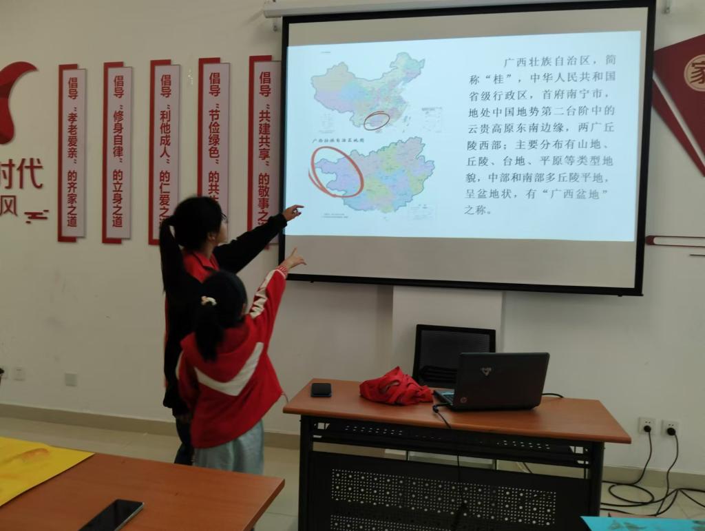 黑衣壮族的王婉入同学为小朋友们分享了民族特色以及背后的文化意义,小朋友们听得津津有味,不时发出惊叹声,在问答互动中对广西壮族自治区的特色美食与风土人情产生了浓厚的兴趣。