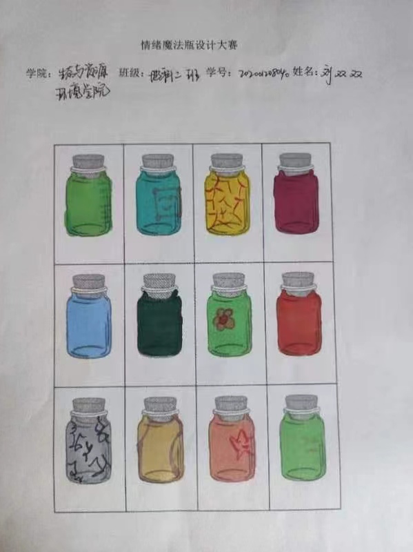 在设计情绪魔法瓶的过程中,同学们开动脑筋,展开想象。一组组或古灵精怪、或积极阳光、或阴云密布又各具特色的魔法瓶在同学们灌注了“情绪魔法”的画笔下绘就。积极阳光的情绪在欢笑中传播,阴云密布的心情在绘画中消散。参加成员都在设计情绪“魔法瓶”的精彩活动中收获了积极的情绪价值,并在心中种下了关心他人和自己情绪的种子,成为社会正能量的传播者。